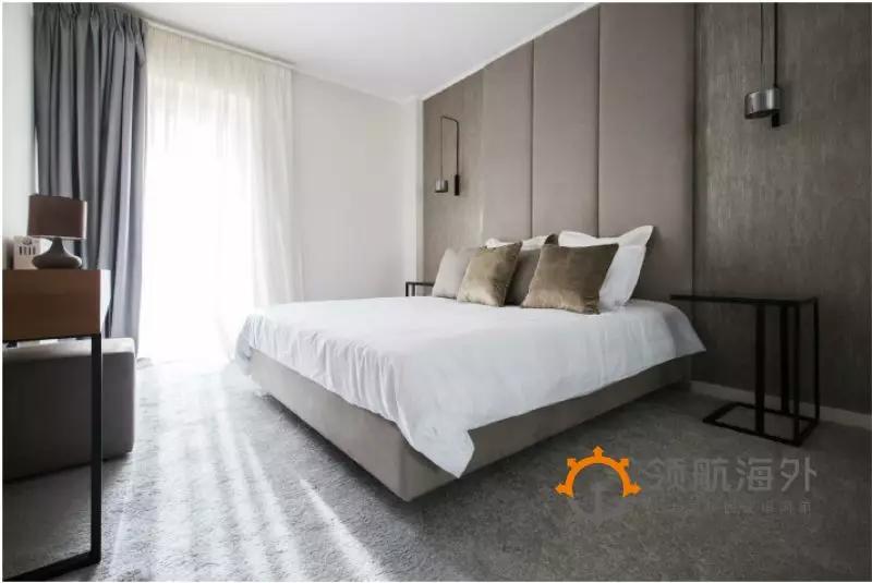 卧室设计大气,细节考究。从地毯壁纸,到床品窗帘,都是精挑细选,足见御用设计师的品味。